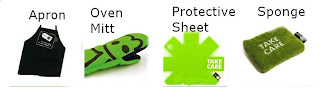 I also received some great accessories to go along with my pan. The include an apron (which I had to give to hubby because it was more like a dress on me I’m so short), the world’s cutest oven mitt, a protective sheet to put inside my pan so other pans don’t scratch it , and a sponge for cleaning my pan. Be sure you follow the cleaning instruction carefully as they are important for keeping your pan working properly.