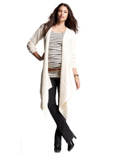 I received the Luxe Drape Cardigan in Ivory to review. I will tell you now that is the most luxurious item in closet at the moment. The feel is so indescribable. It is a cotton and merino wool-blend that feels like you have wrapped yourself in a cloud when you put it on. I have been able to use it several mornings in the past week. It washes well however it is a hand wash item. You also have to lay flat to dry. So this item is much more of an investment piece than a throw on piece. It hangs very well but the ends can be draped across you to keep warm or for a more stylish look. This is a piece that, if care for properly, will stand the test of time and well beyond your maternity stages.